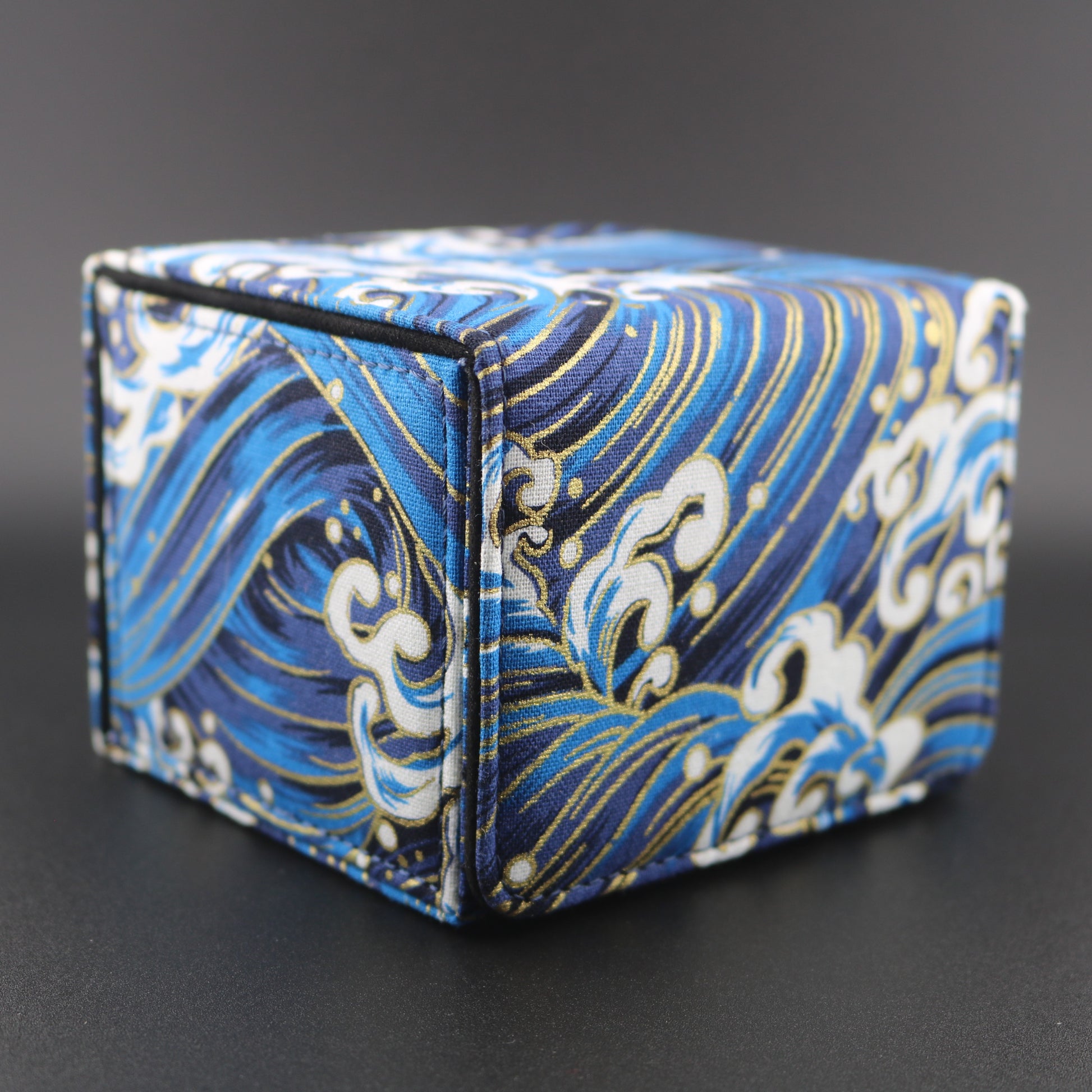 This elegant deck box can hold up to 100 double sleeved cards. With a strong magnetic closure and suede interiors, your cards will be safe and secure. This deck box is perfect for Magic: the Gathering, Yu-gi-oh, Pokemon, and Lorcana decks.