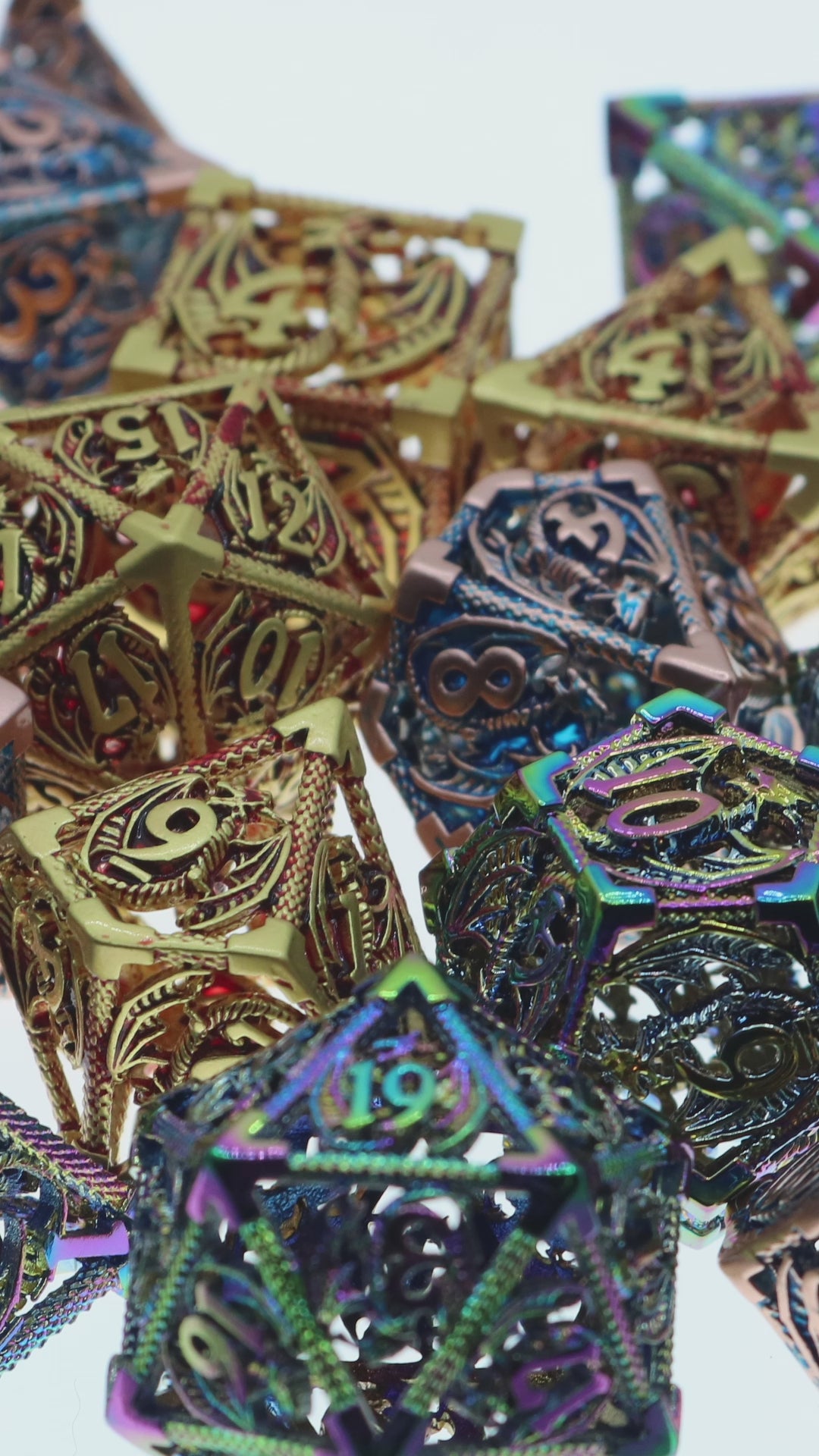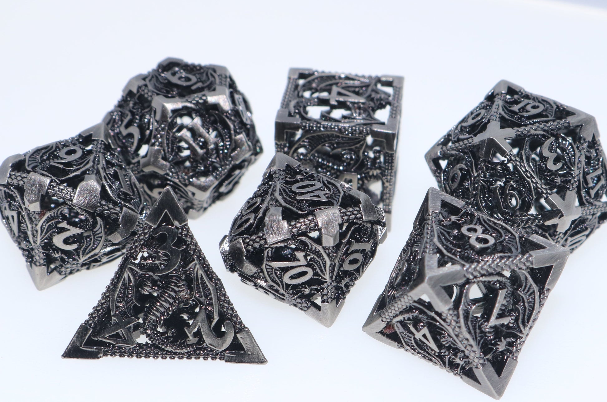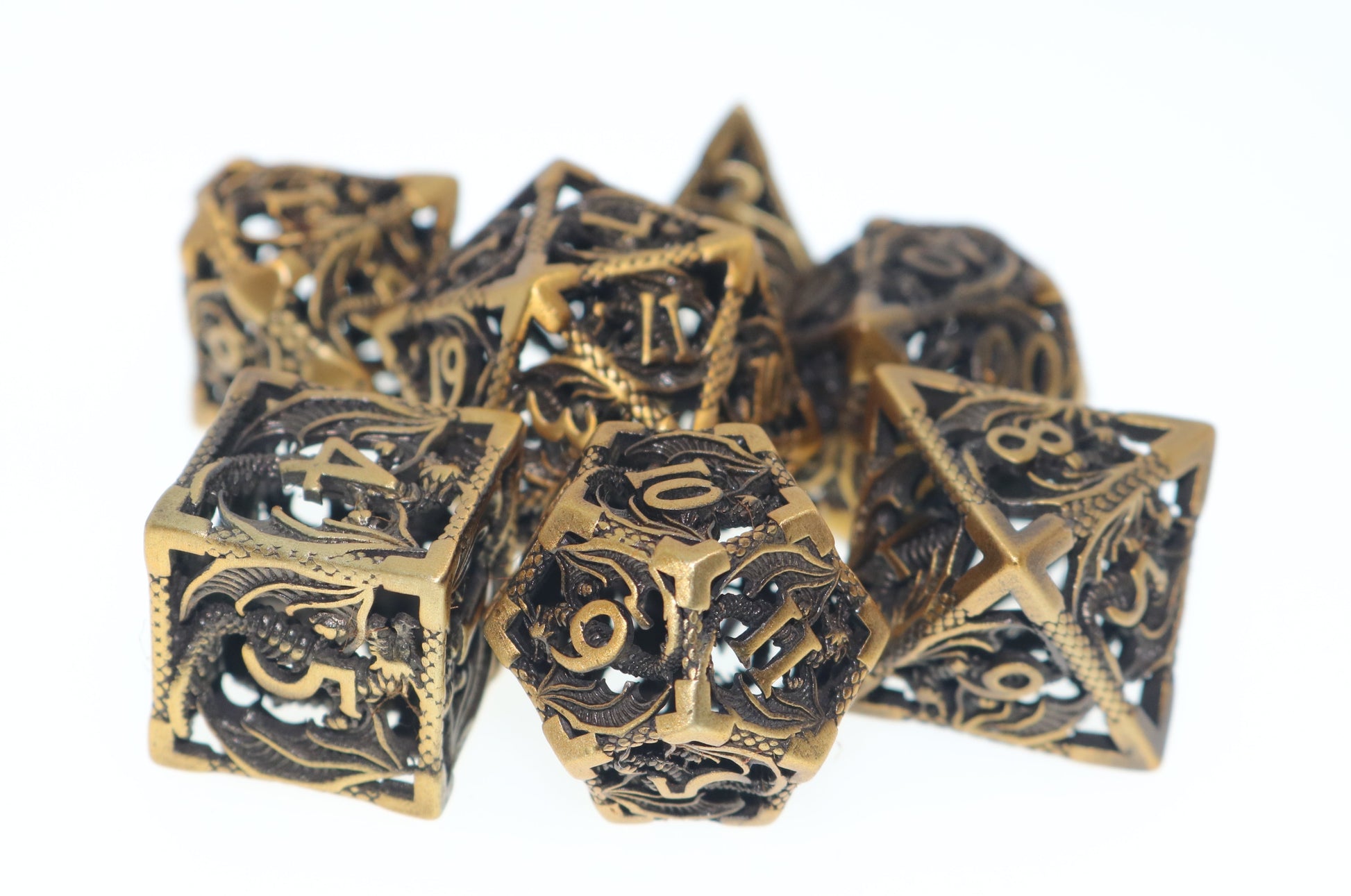 These hollow metal dice have an intricate dragon design flying behind each number. When you want hollow dice with medieval intensity, these are the dice for you!