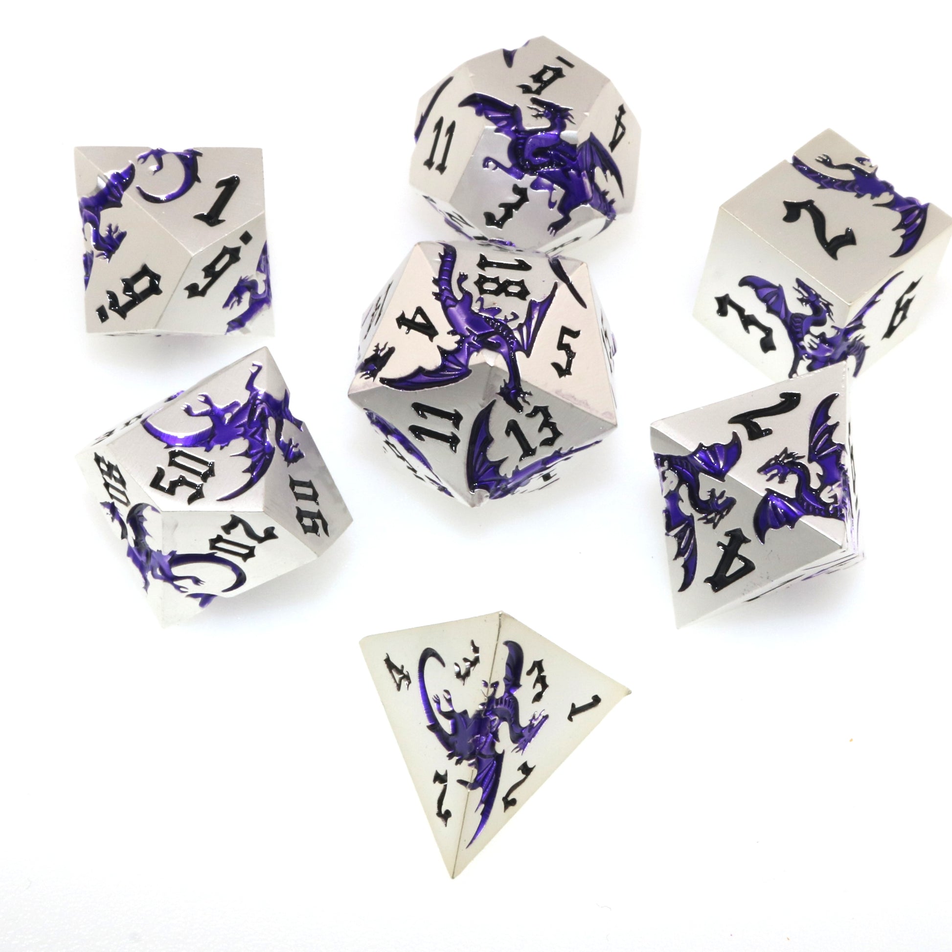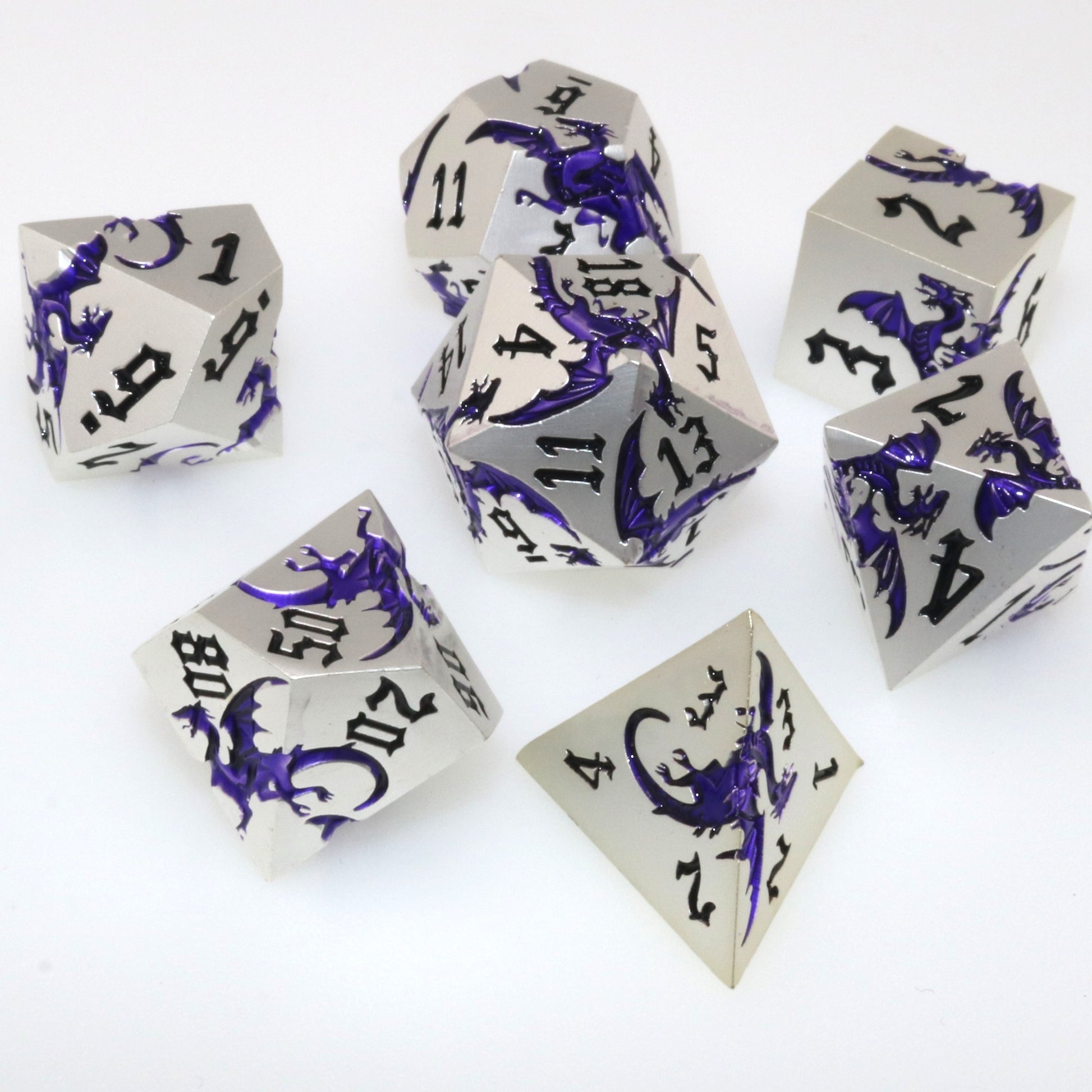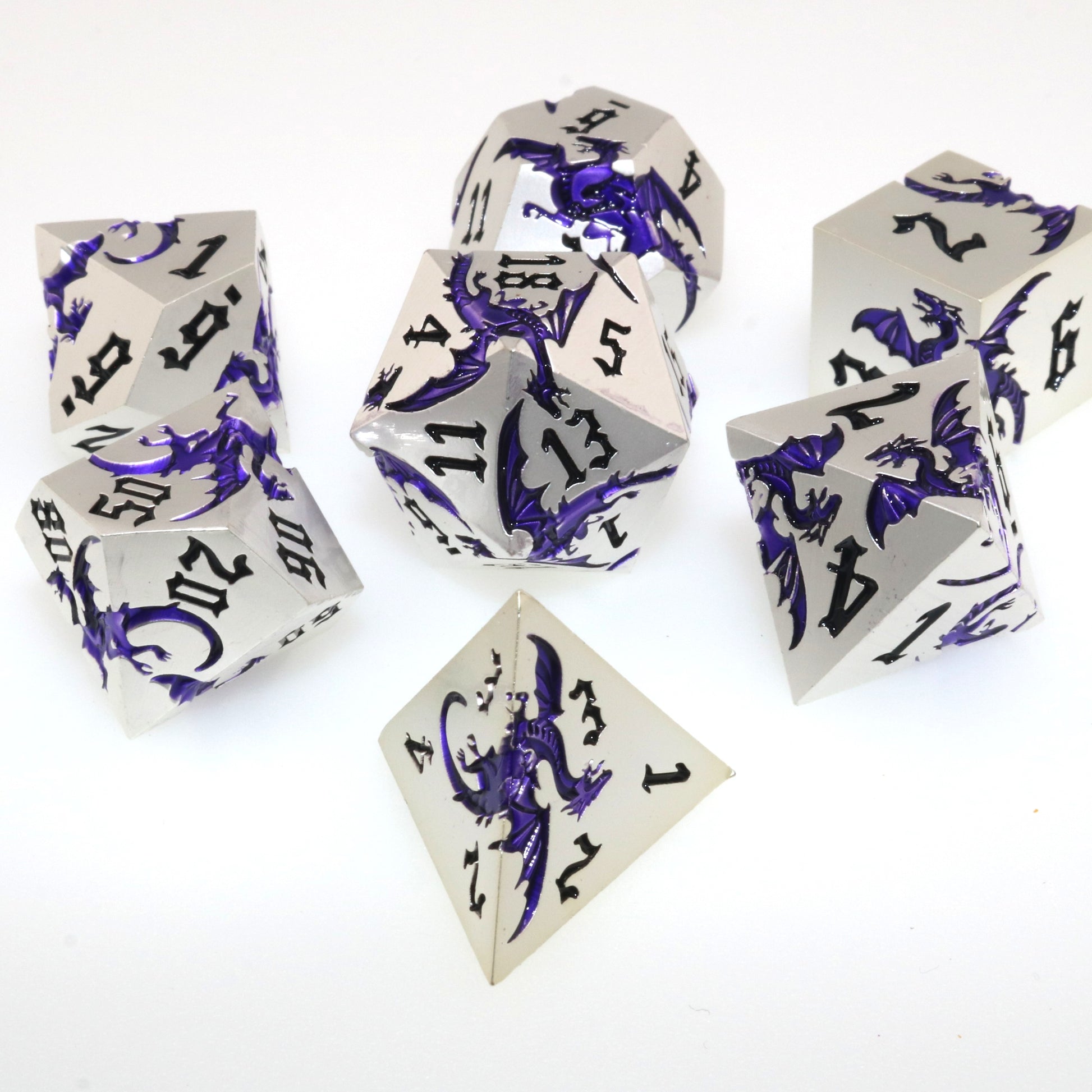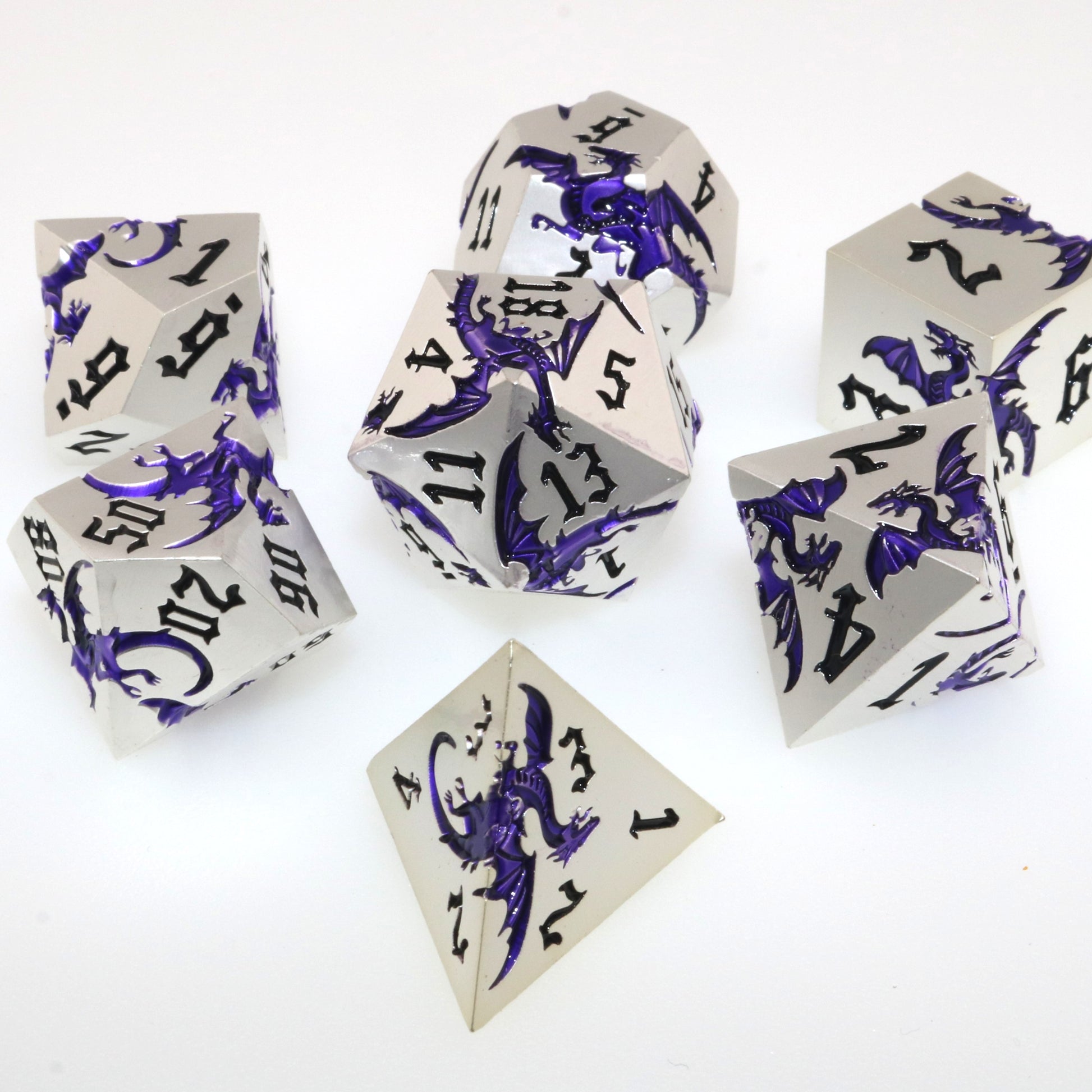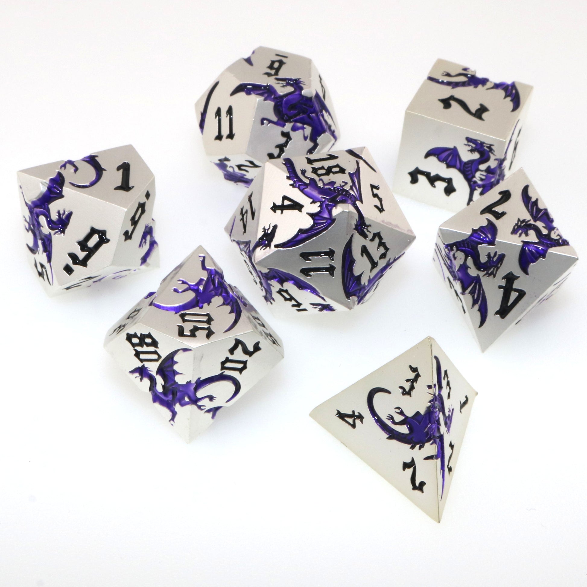 These solid metal dice are etched with swirling dragons hunting for their next prey. Channel the dragons' relentless hunt in your next character.