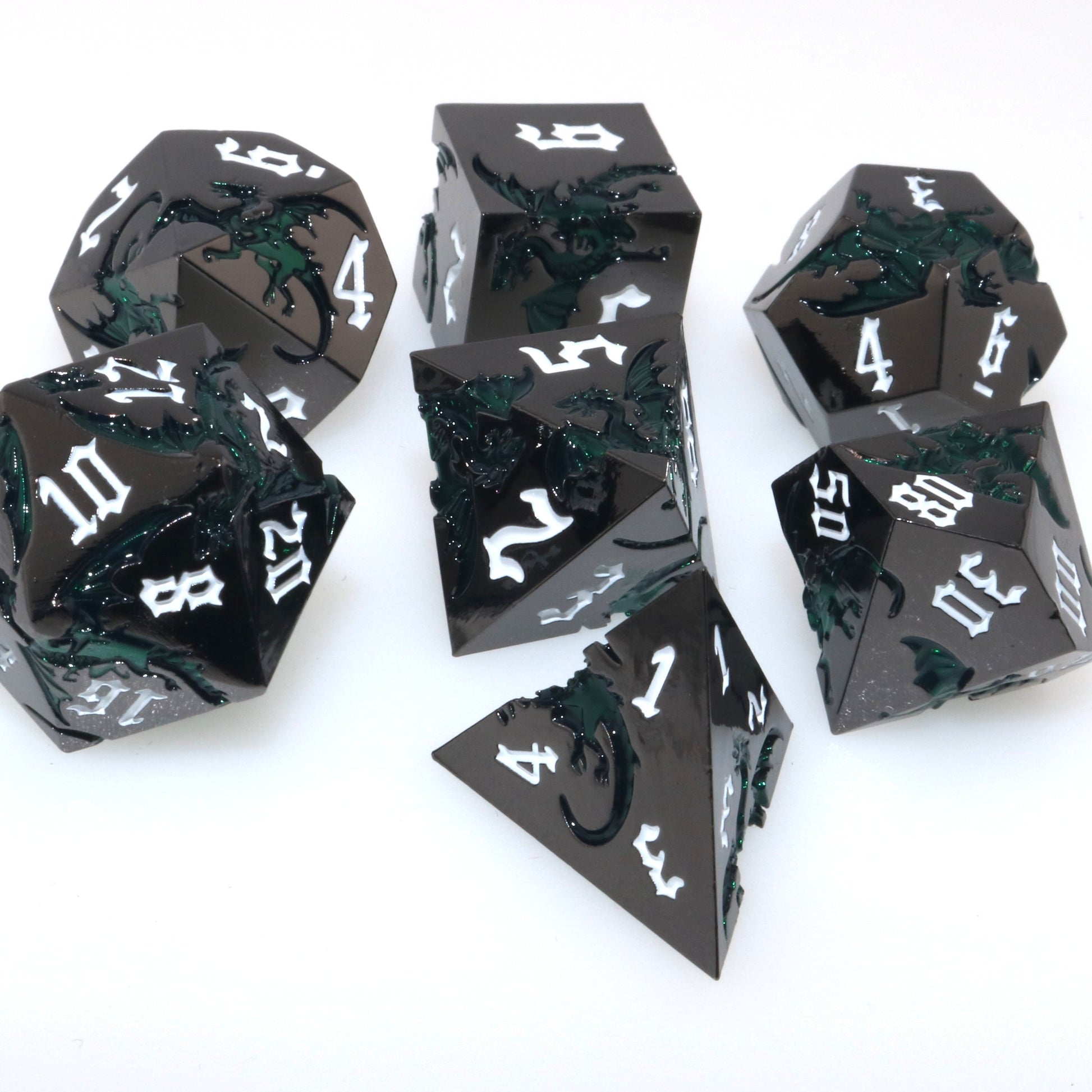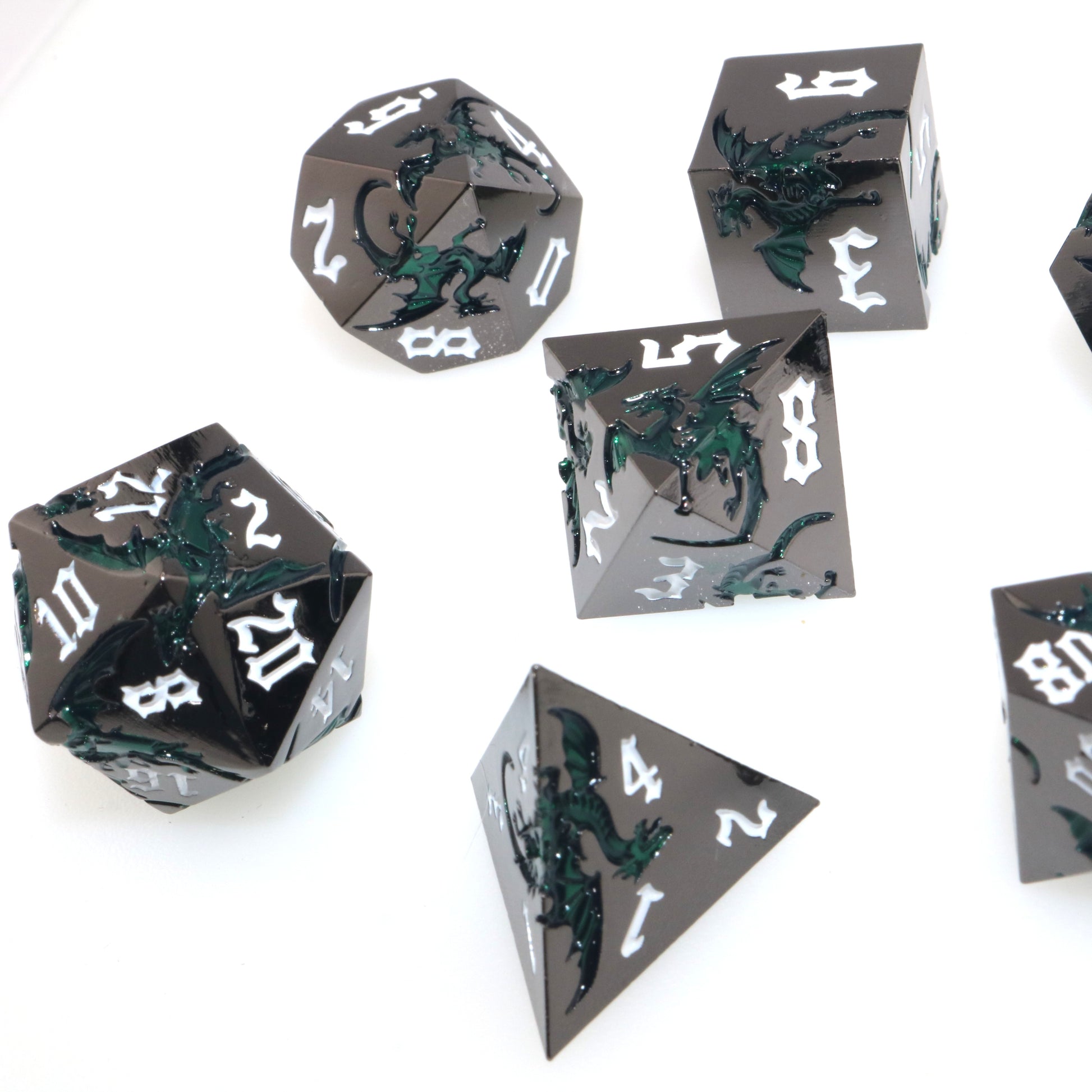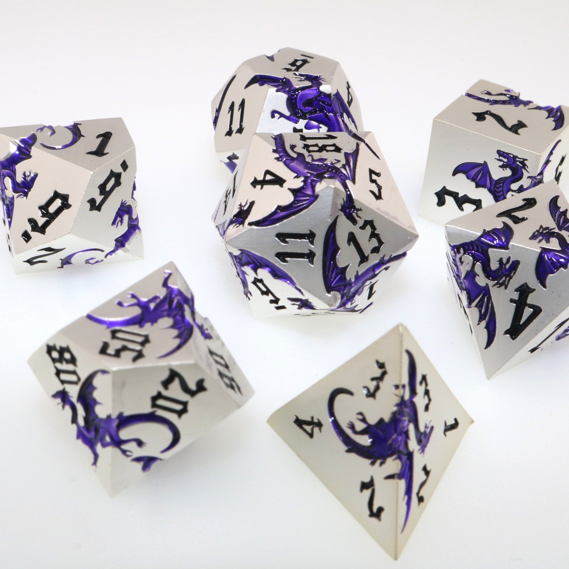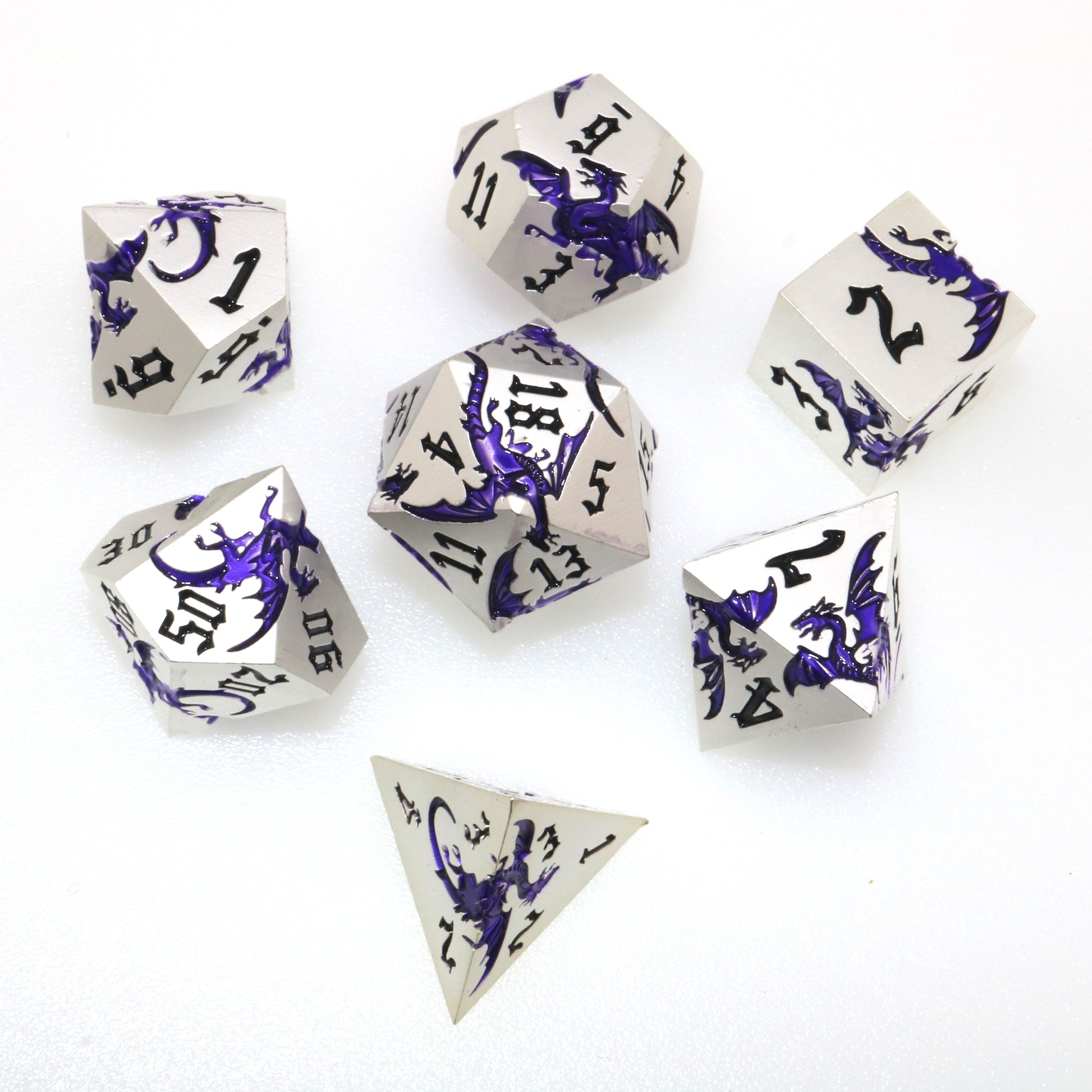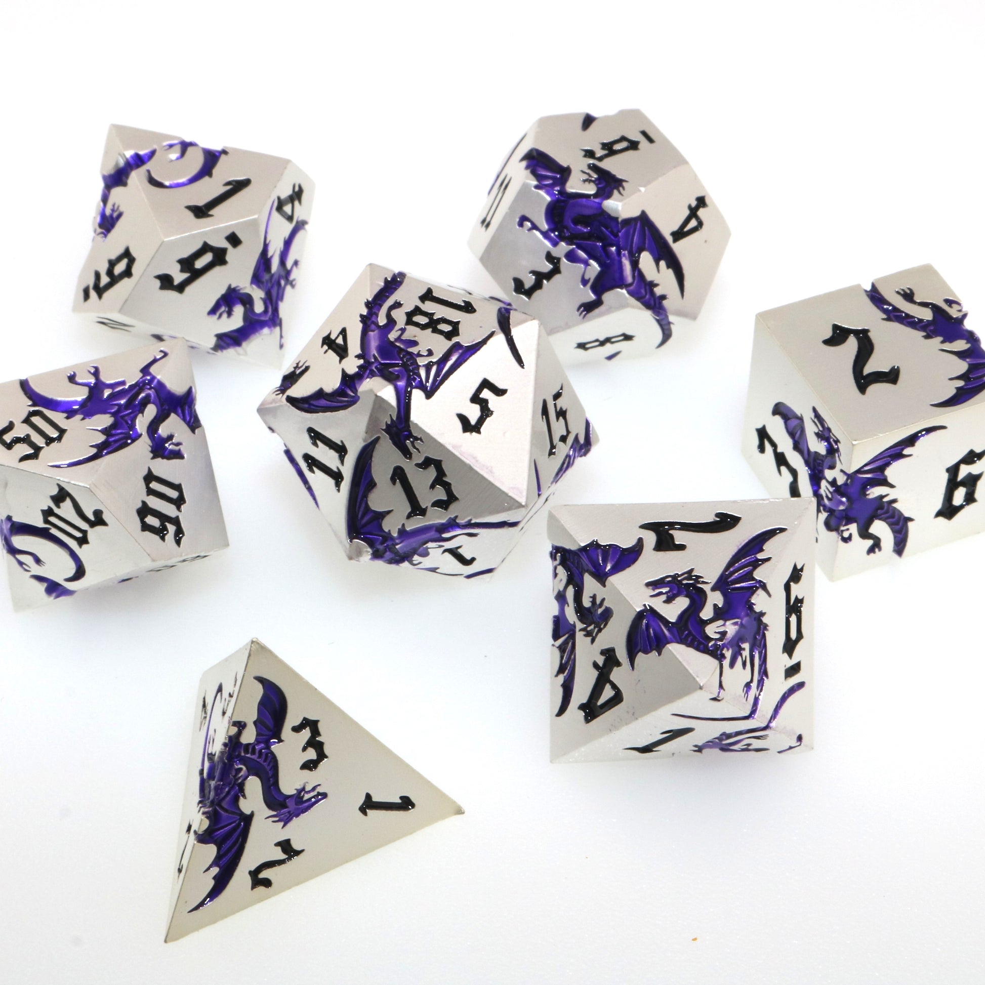 These solid metal dice are etched with swirling dragons hunting for their next prey. Channel the dragons' relentless hunt in your next character.