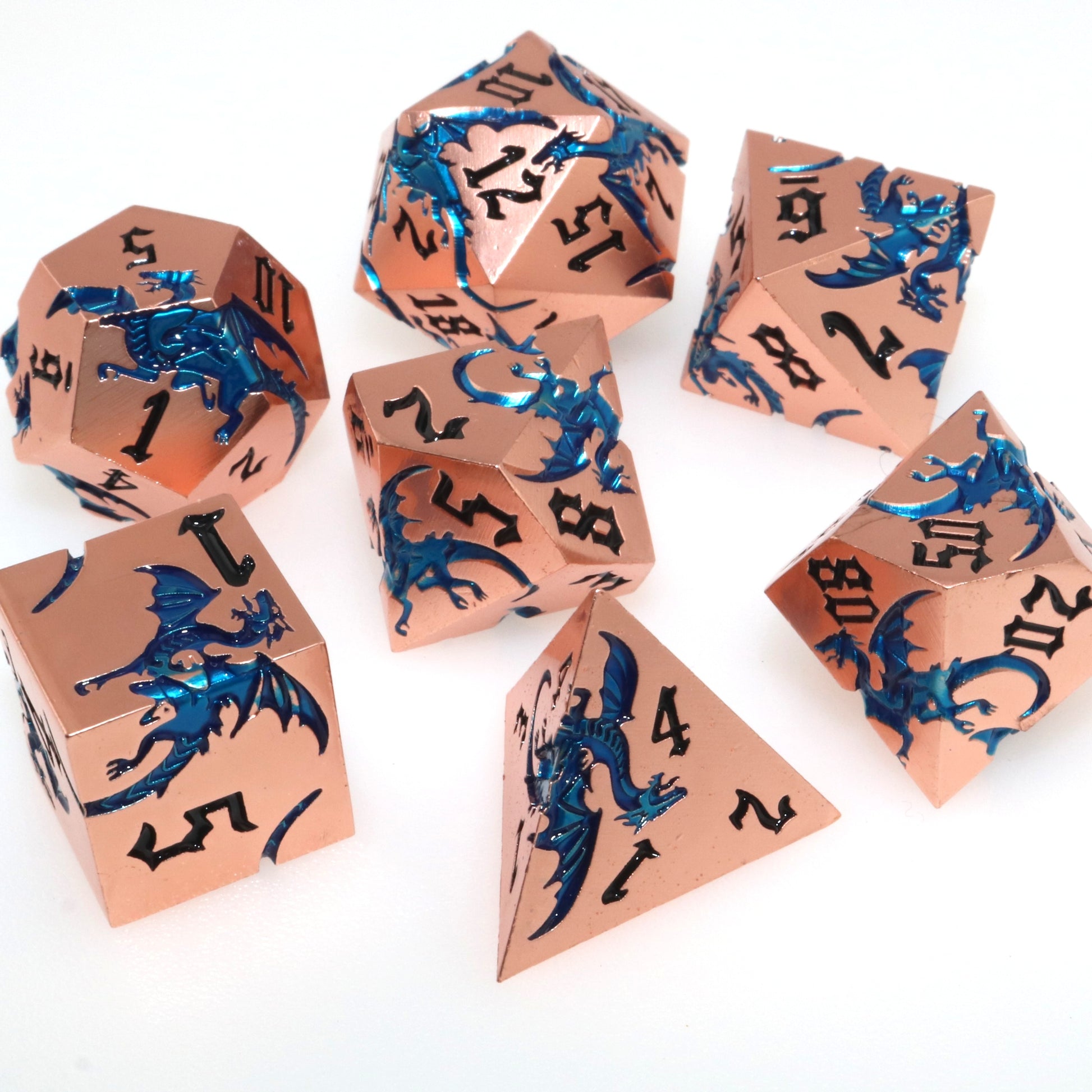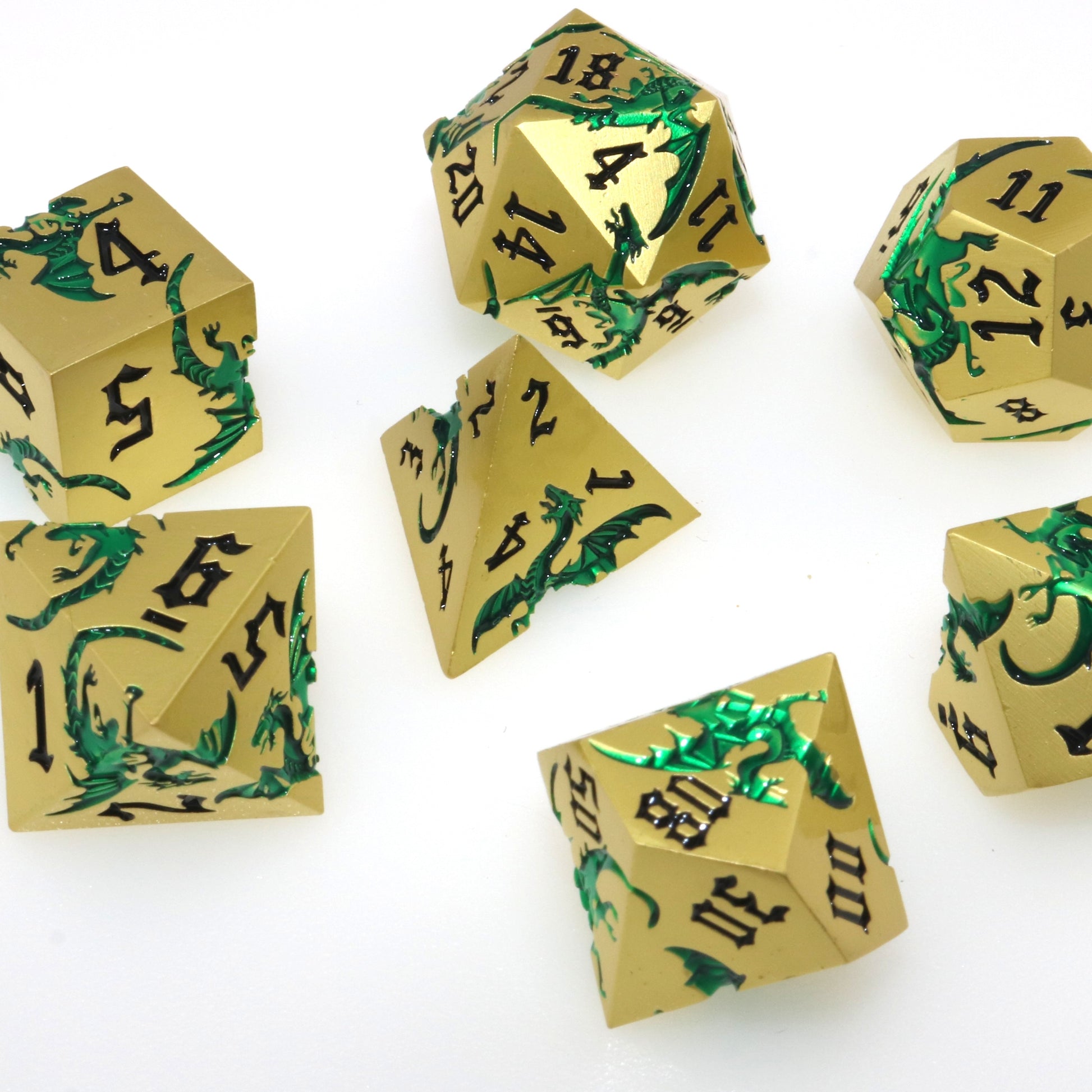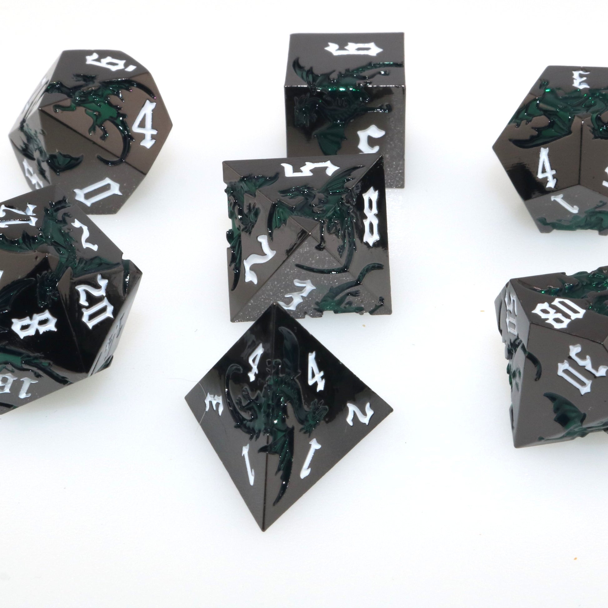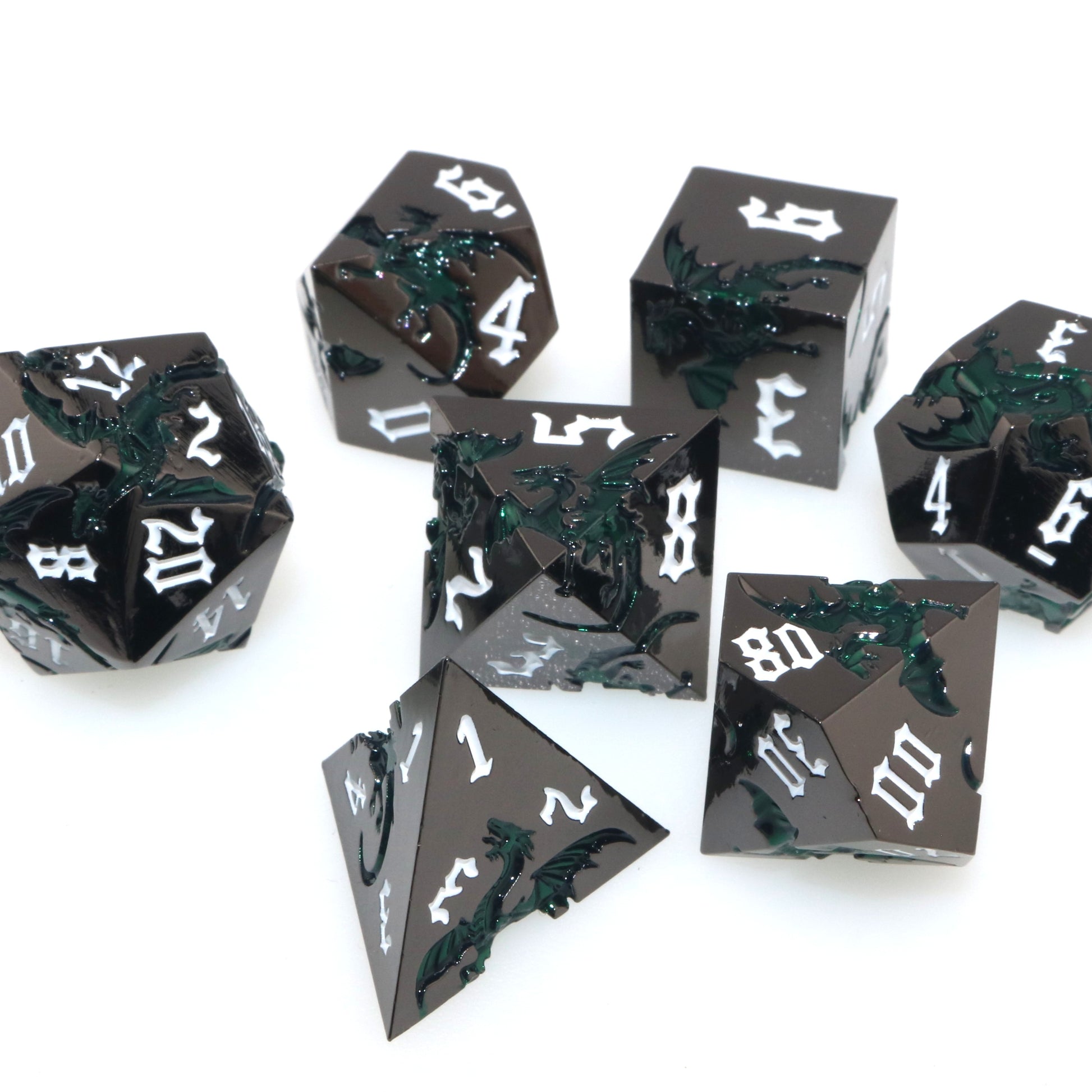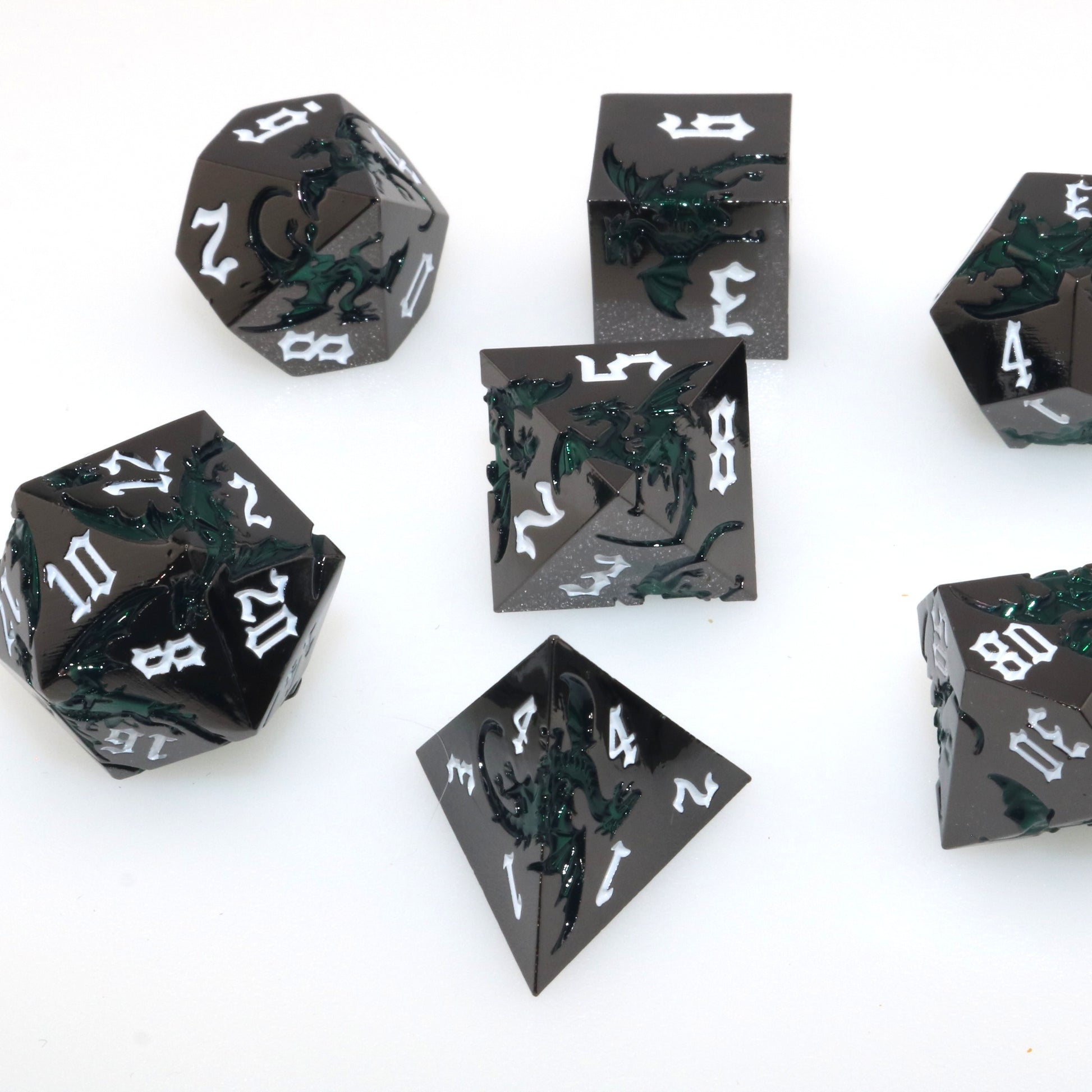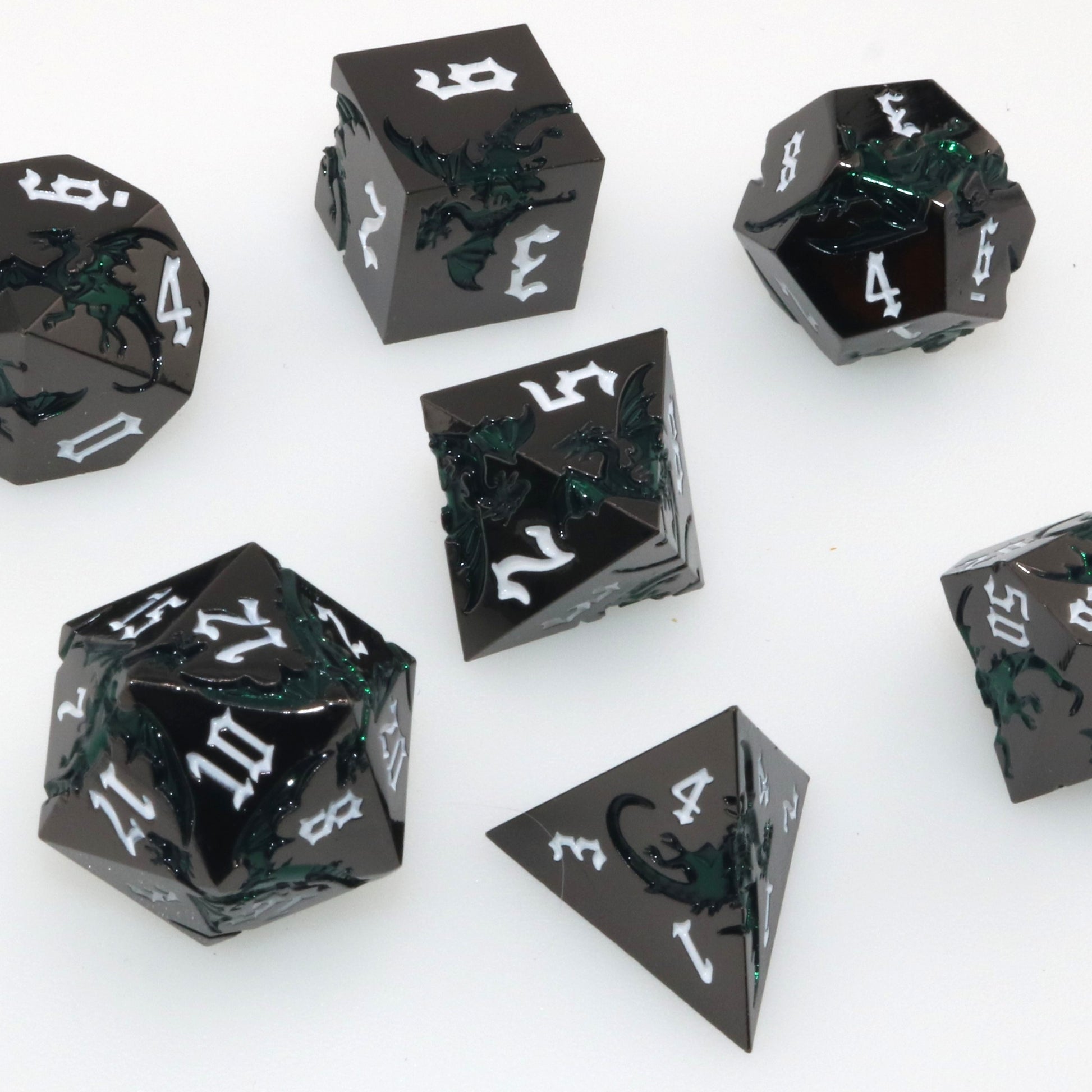 These solid metal dice are etched with swirling dragons hunting for their next prey. Channel the dragons' relentless hunt in your next character.