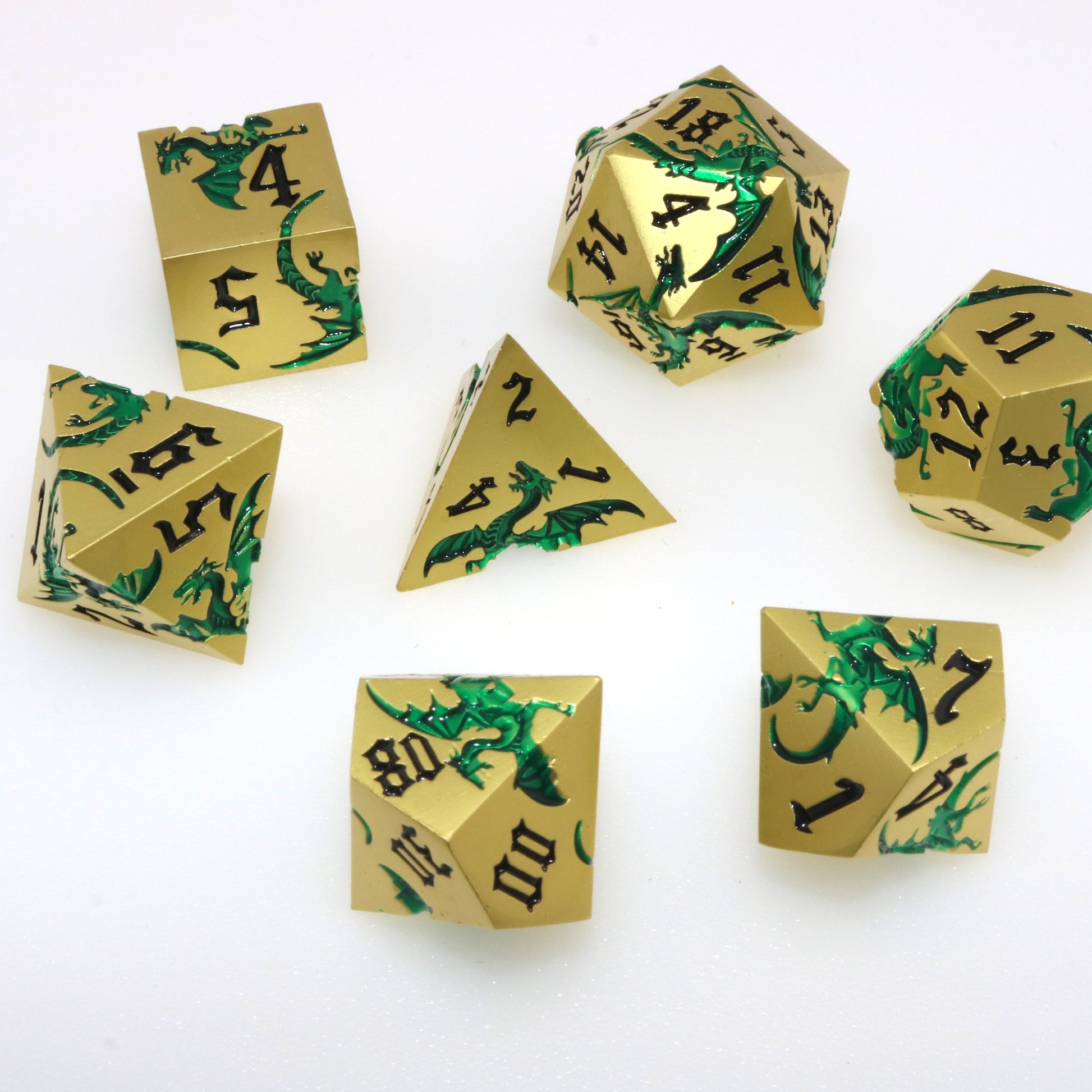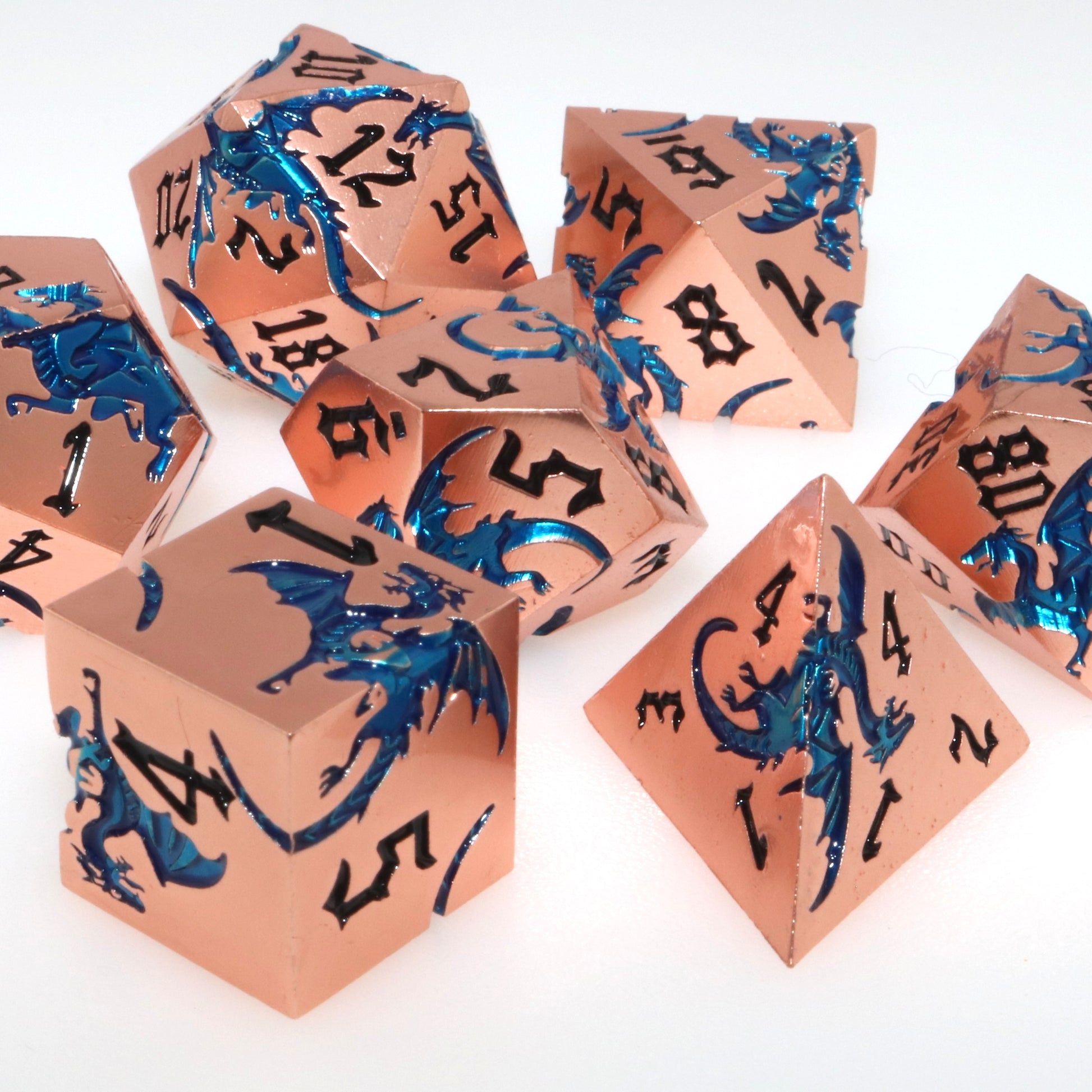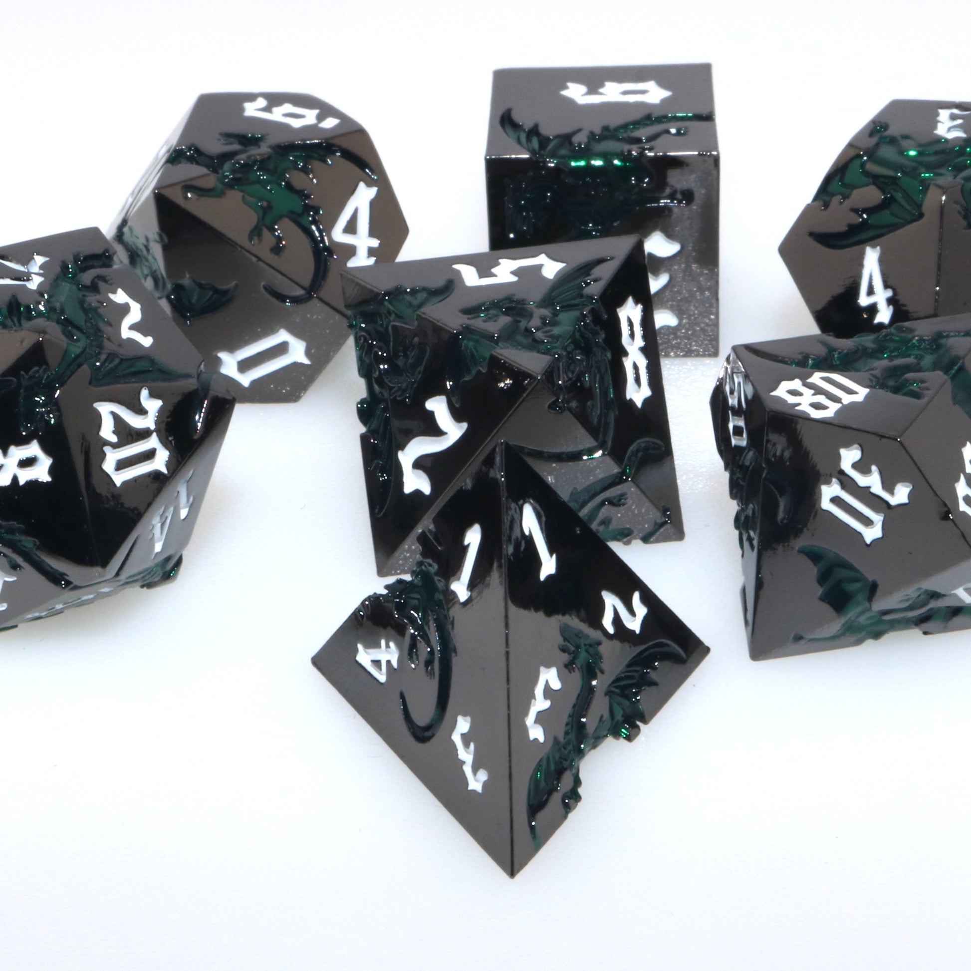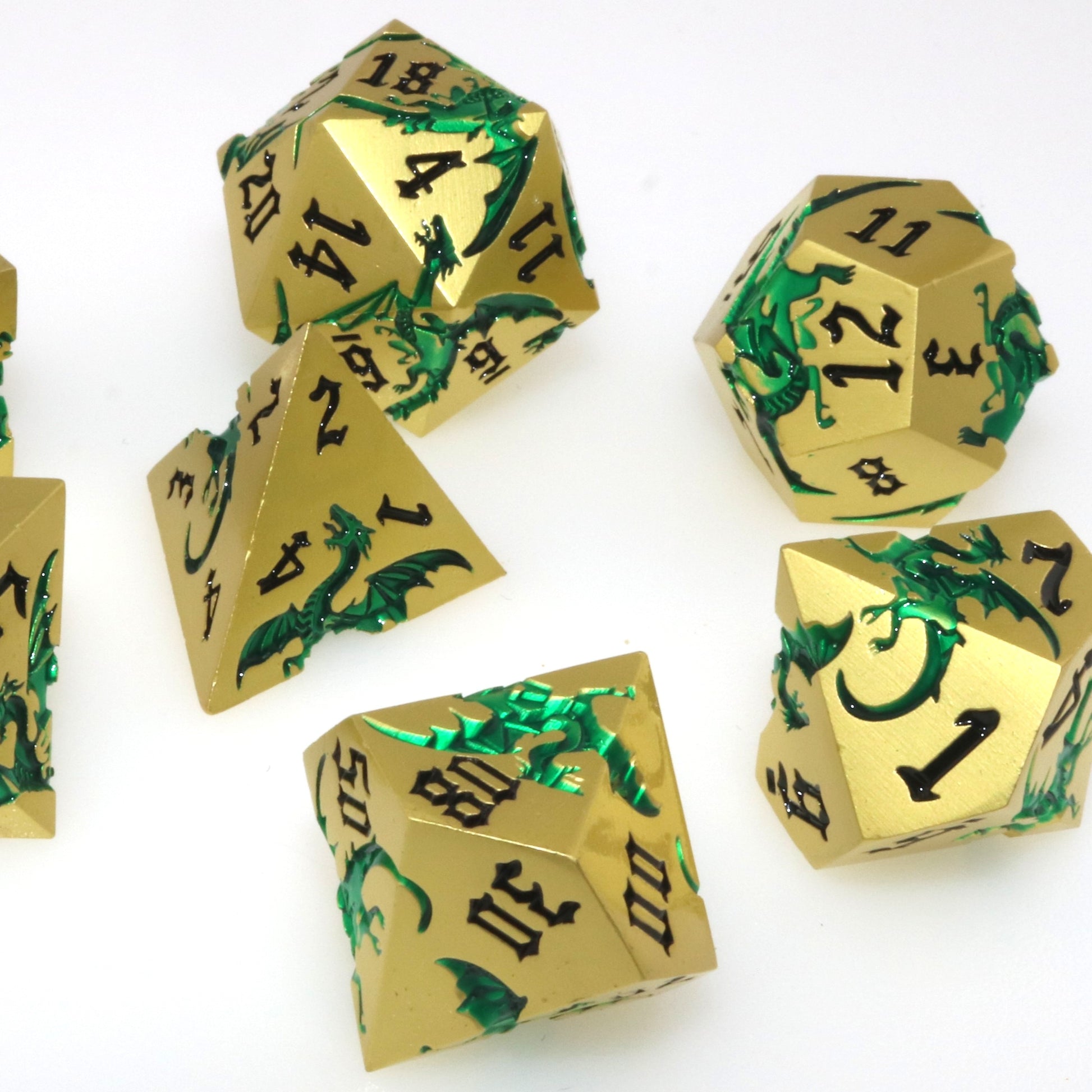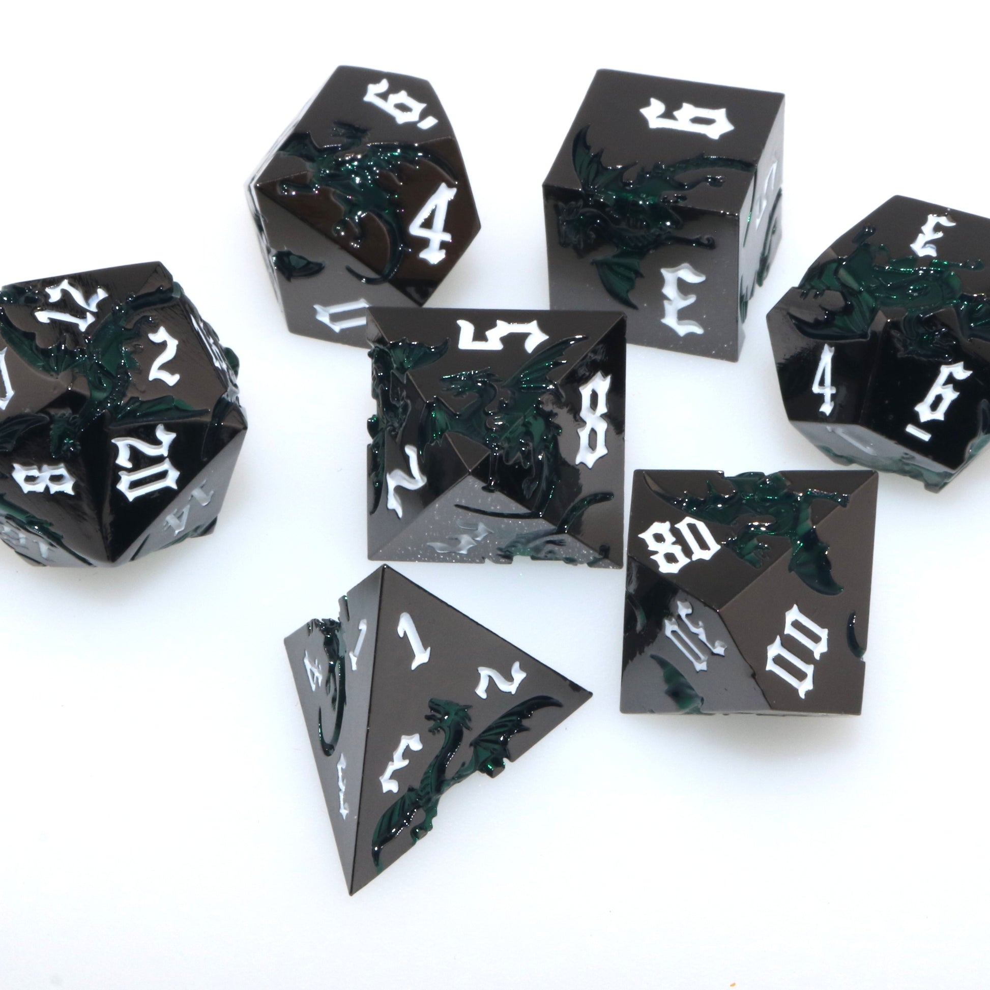 These solid metal dice are etched with swirling dragons hunting for their next prey. Channel the dragons' relentless hunt in your next character.