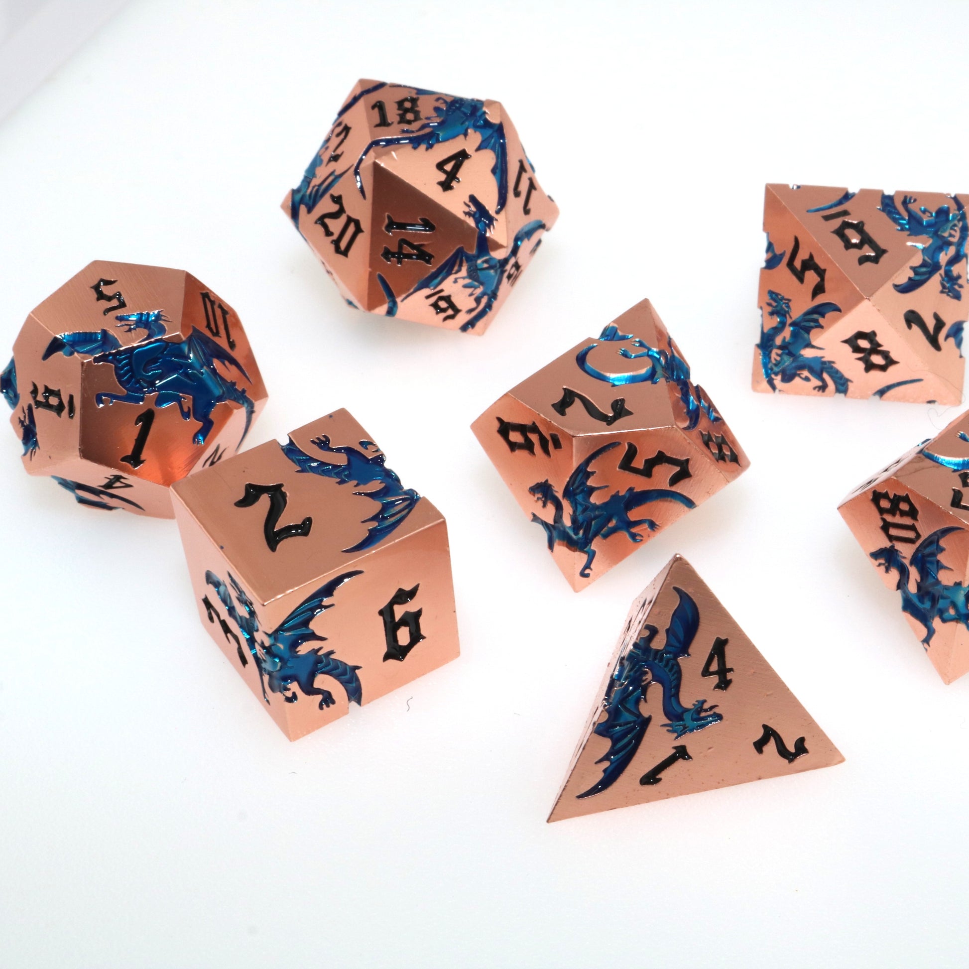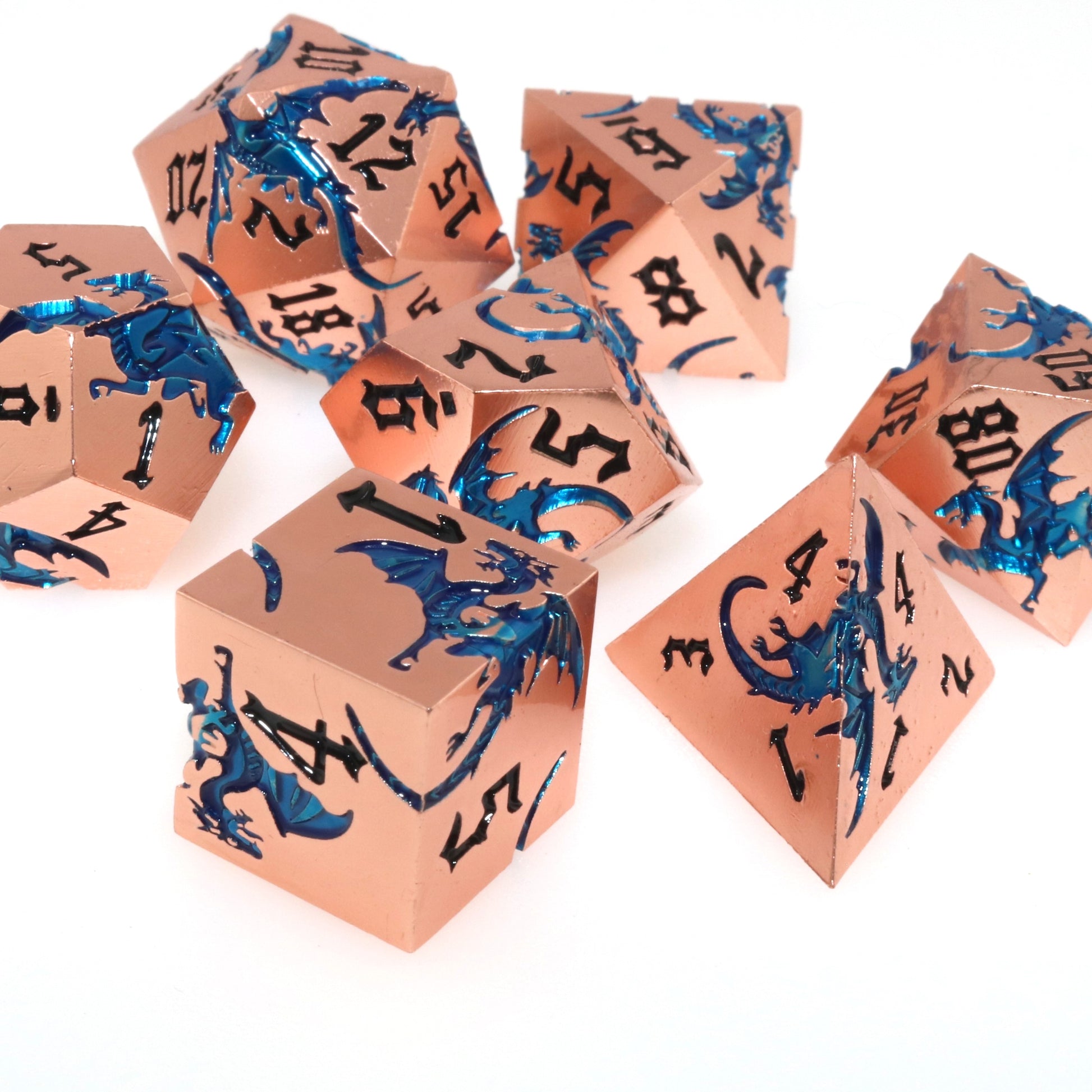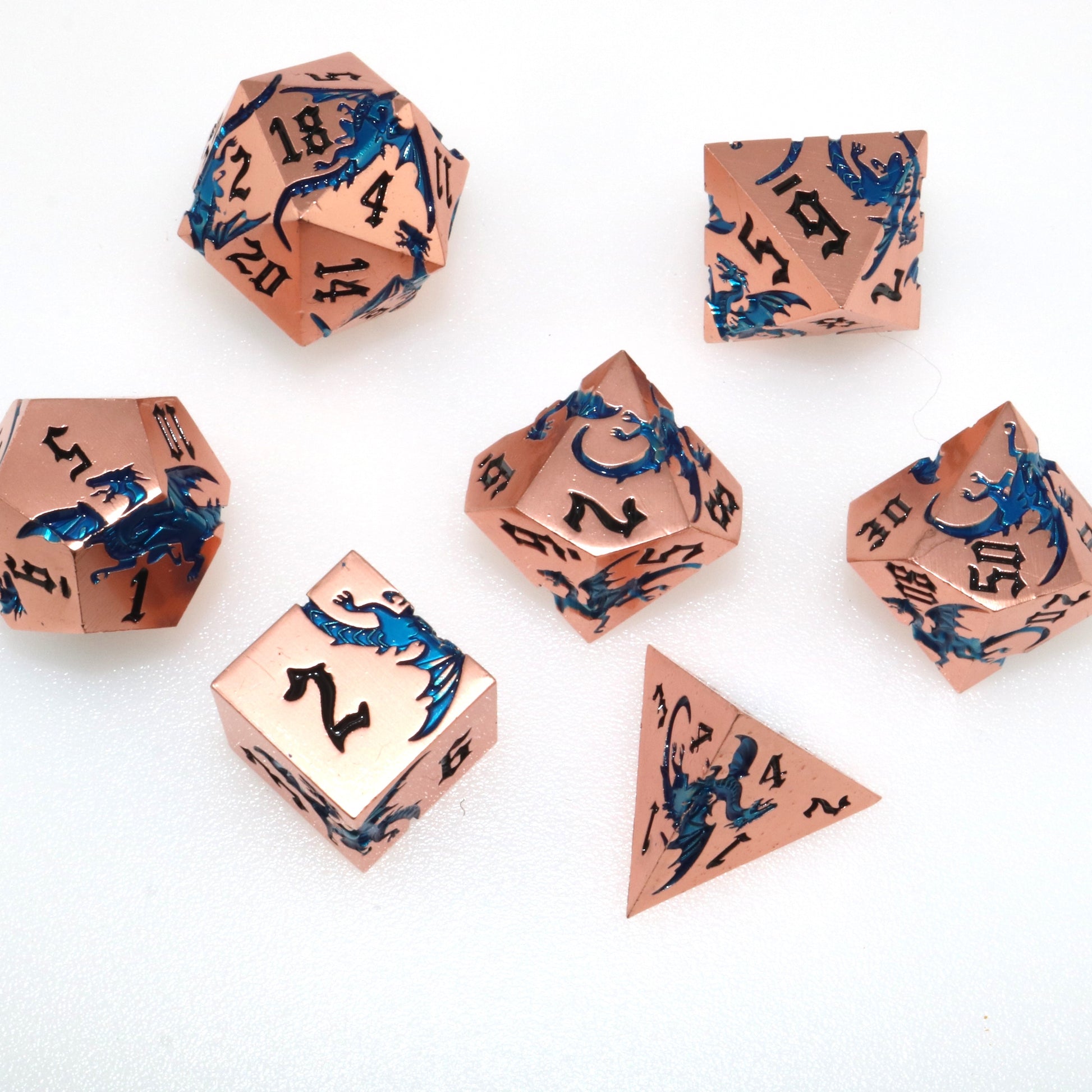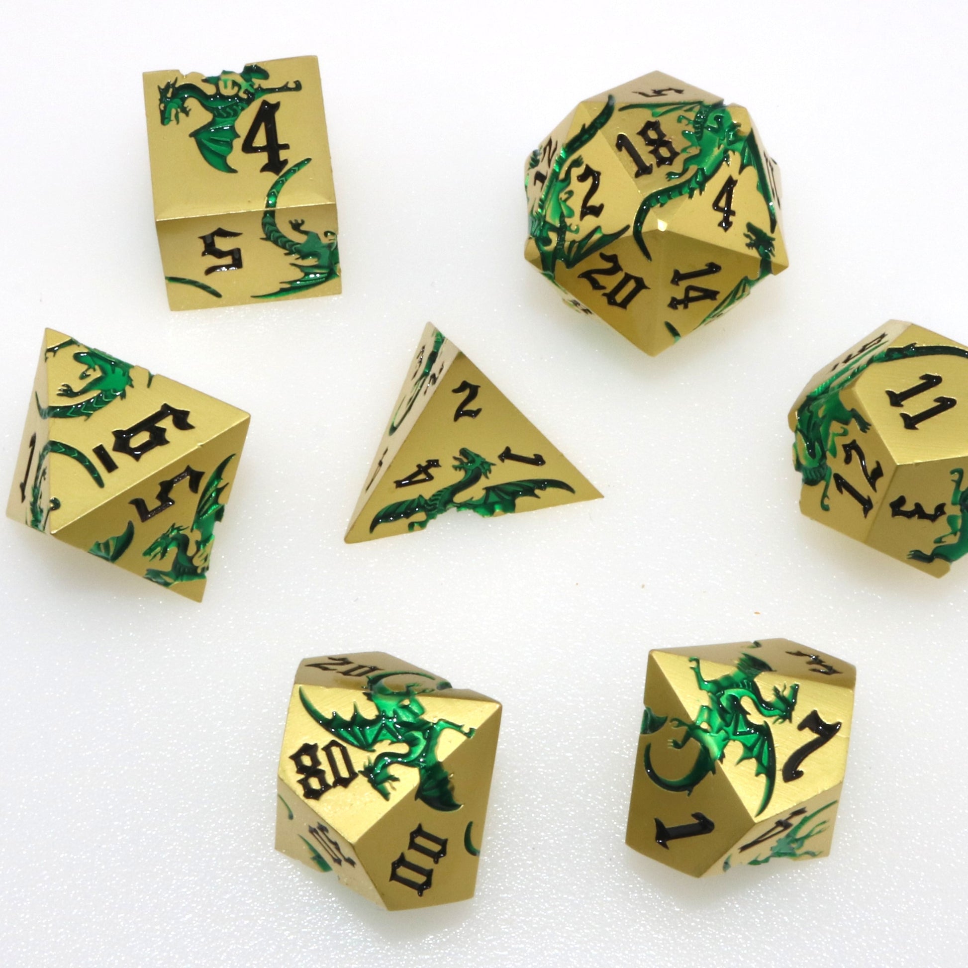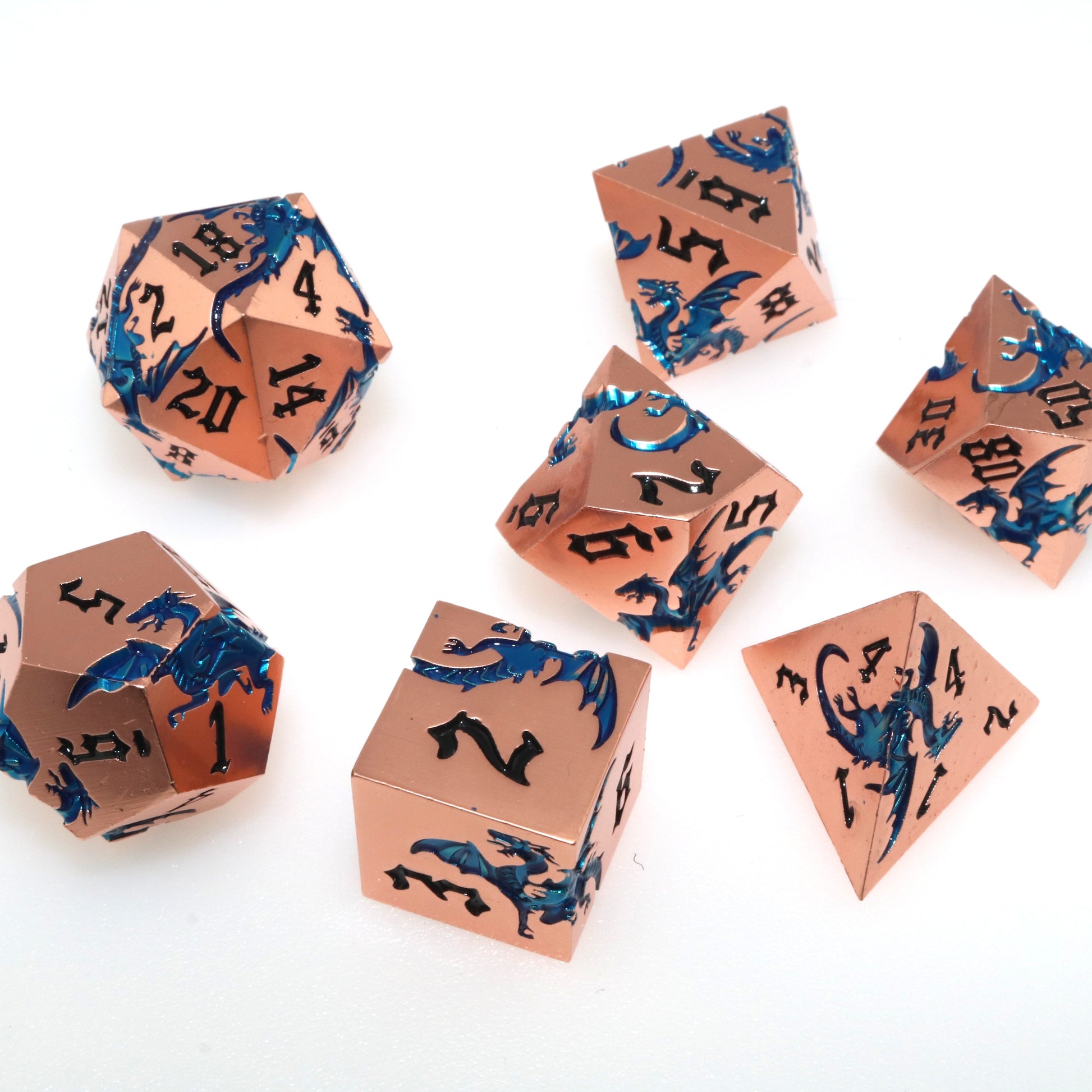 These solid metal dice are etched with swirling dragons hunting for their next prey. Channel the dragons' relentless hunt in your next character.